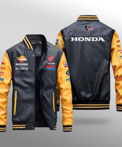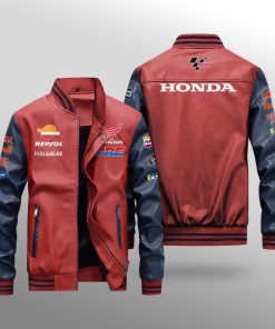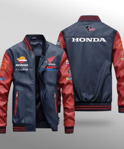 - This llight-weight Honda leather jacket with a high collar, full-zip front, and side seam pockets completes a stylish look for cool weather.