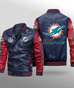 - This llight-weight Dolphins leather jacket with a high collar, full-zip front, and side seam pockets completes a stylish look for cool weather.